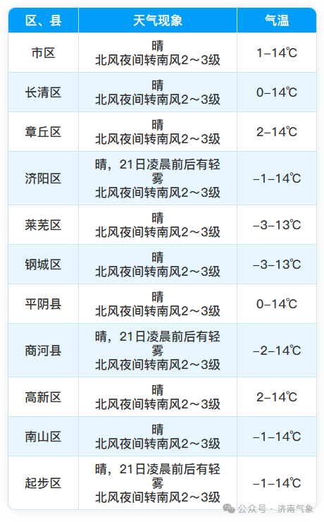 晴,21日凌晨前后北部地区有轻雾,北风夜间转南风2~3级,最低气温市区1℃左右,其他区县-3~2℃,最高气温14℃左右。