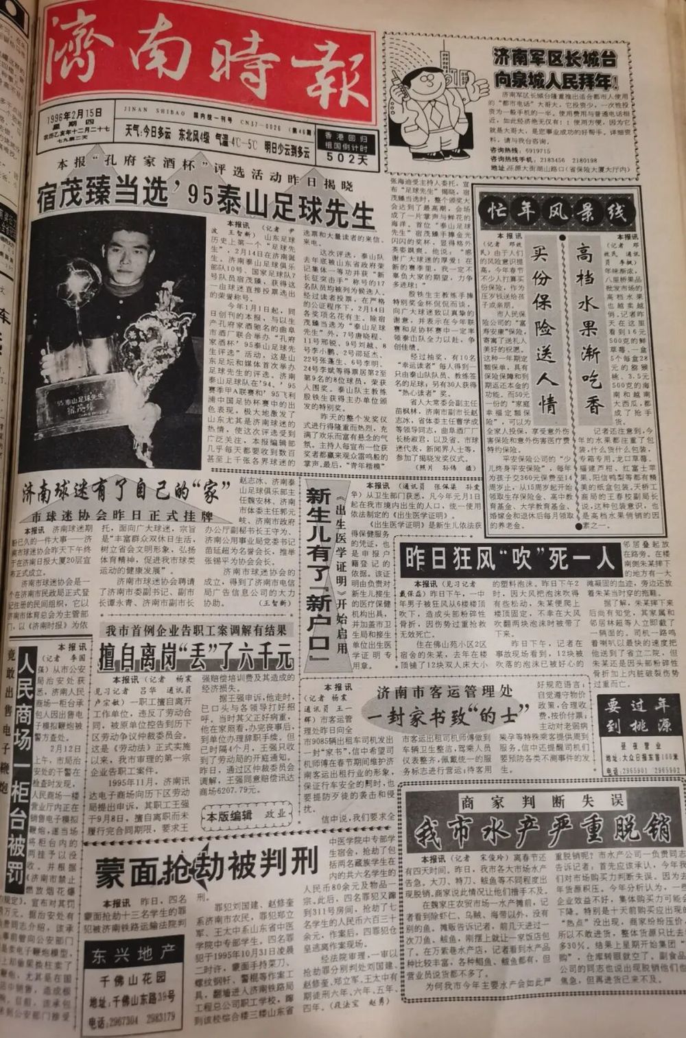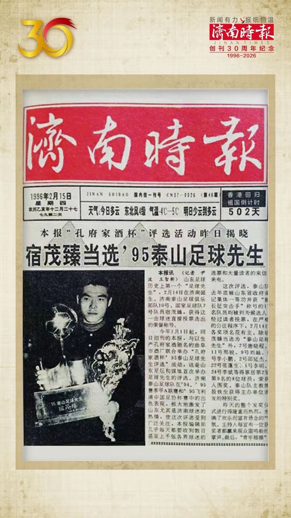 1996年2月16日出版的头版报纸刊登《宿茂臻当选’1995泰山足球先生》