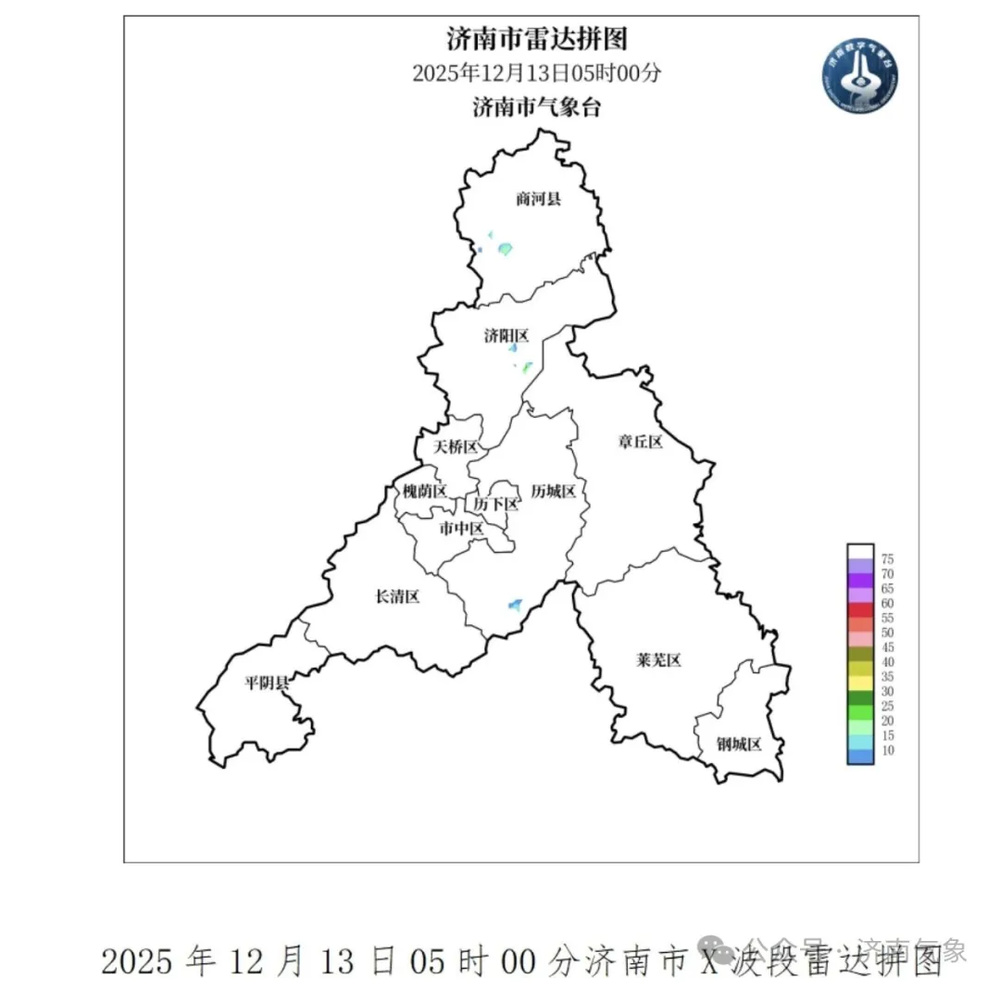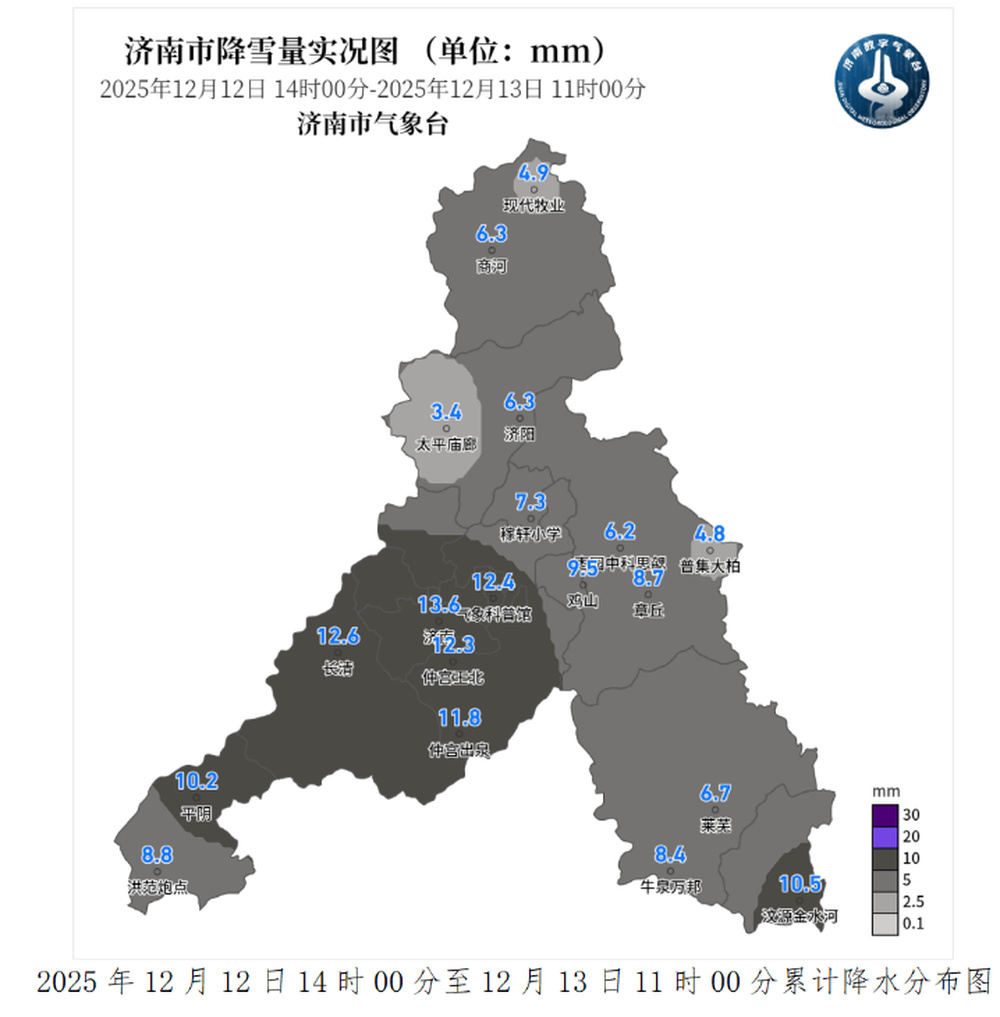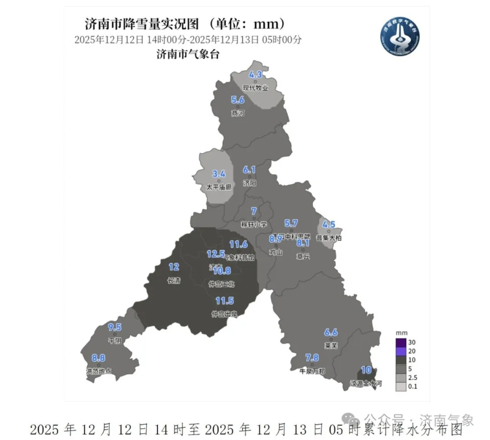根据气象观测站网统计,2025年12月12日14时00分至2025年12月13日05时00分降水量(毫米):济南全市平均8.3(市中区济南最大12.5),折合水量约0.85亿立方,市区12.5长清区11.8平阴县9.2济阳区6.1商河县4.9章丘区6.1莱芜区7.2钢城区10.0南山区11.2起步区3.4历城区11.6高新区8.0。