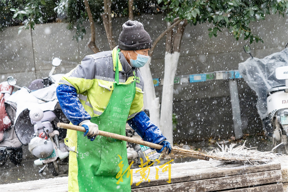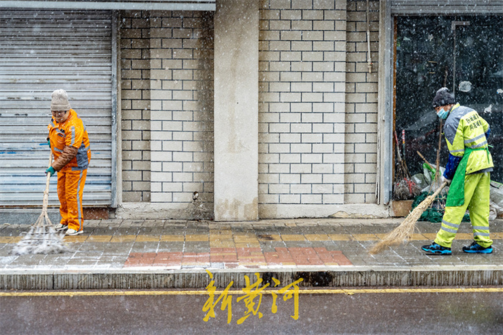 16:10,在济南洪家楼附近,环卫工人冒雪清扫道路。