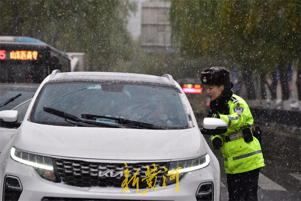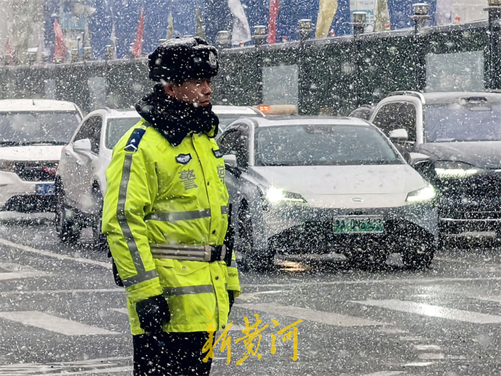 雪中,在济南各路口执勤的交警身上已落满雪花。他们坚守在街头,疏堵保畅,守护市民平安出行。