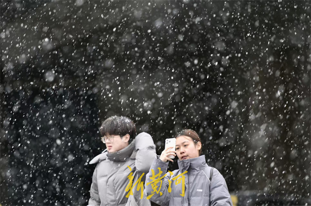 在济南经七路房产大厦附近,市民“晒”出初雪的快乐。