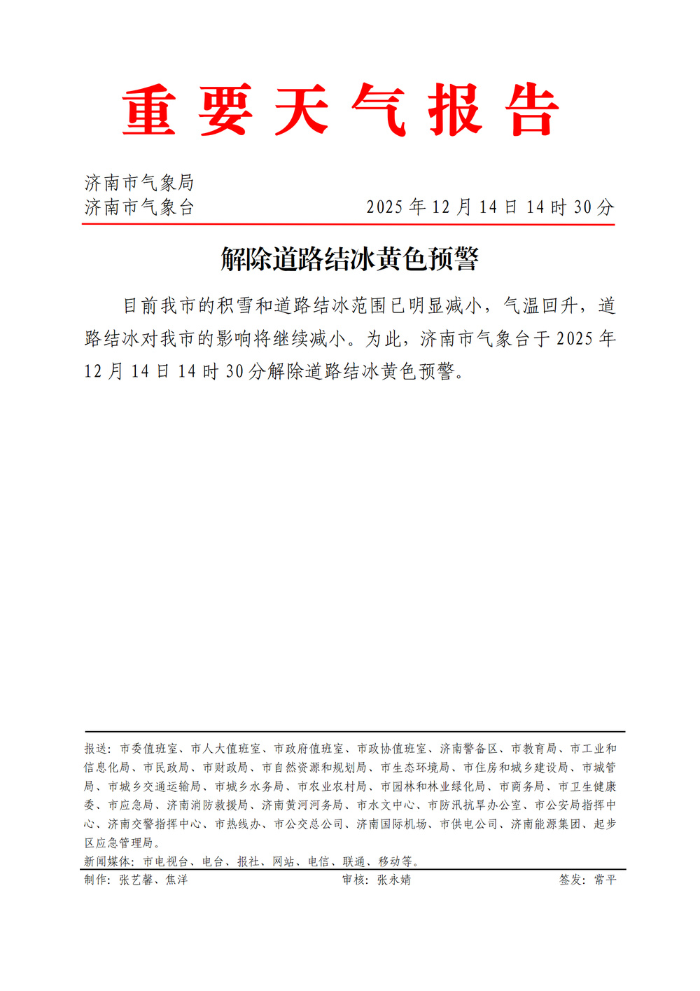 14日14时30分,济南市气象台解除道路结冰黄色预警。