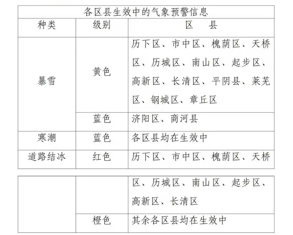 13日14时35分,济南将道路结冰红色预警降级为道路结冰黄色预警
