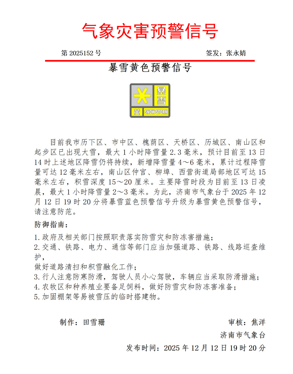 目前济南市历下区、市中区、槐荫区、天桥区、历城区、南山区和起步区已出现大雪,最大1小时降雪量2.3毫米,预计目前至13日14时上述地区降雪仍将持续,新增降雪量4~6毫米,累计过程降雪量可达12毫米左右,南山区仲宫、柳埠、西营街道局部地区可达15毫米左右,积雪深度15~20厘米。主要降雪时段为目前至13日凌晨,最大1小时降雪量2~3毫米。为此,济南市气象台于2025年12月12日19时20分将暴雪蓝色预警信号升级为暴雪黄色预警信号,请注意防范。