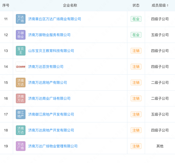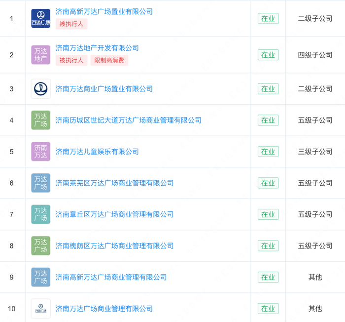 济南高新万达广场系王健林名下万达集团成员企业,目前,万达集团拥有1836家成员企业。除此次被收购的济南高新万达广场置业有限公司,济南还有18家成员企业,其中7家已注销。存续的11家公司包括济南万达地产开发有限公司、济南万达商业广场置业有限公司、济南万达儿童娱乐有限公司、济南万达广场商业管理有限公司、济南万御物业服务有限公司,以及6家万达广场商业有限公司。