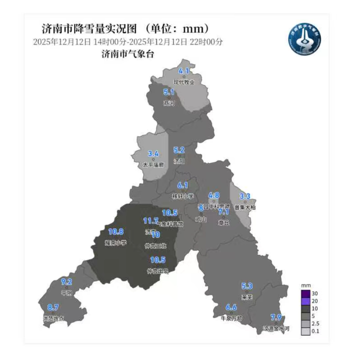 济南市气象台根据气象观测站网统计,12月12日14时至22时,全市平均降水量达7.5毫米,折合水量约0.77亿立方米,其中市区11.7毫米,长清区11.1毫米,平阴县8.9毫米,济阳区5.2毫米,商河4.6毫米,章丘区5.1毫米,莱芜区5.9毫米,钢城区7.9毫米,南山区10.2毫米,起步区3.4毫米,历城区10.5毫米,高新区7毫米。