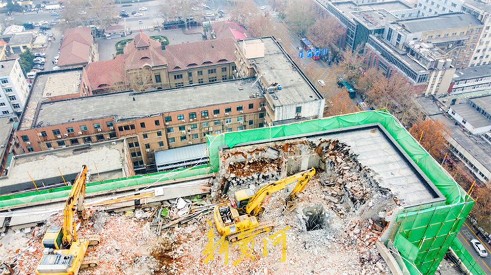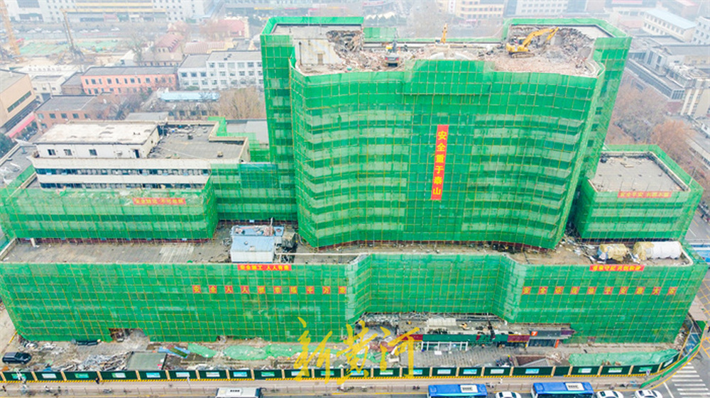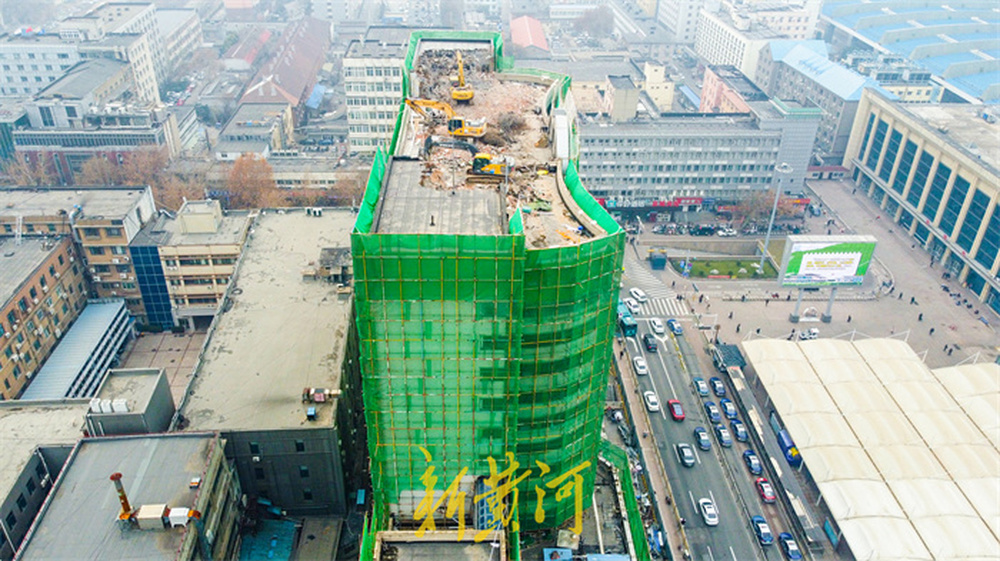 12月19日,在济南火车站南广场南侧的地标性建筑天龙大厦,大厦外墙已全部覆盖绿色防尘网,楼顶的破拆设备在完成顶层设备用房拆除后,已暂时停止外部作业。据现场施工安排,工程现已转入内部拆除阶段。施工人员正对大楼内部的电梯、机电设备及各类管线进行全面移除,逐步将整栋大楼“掏空”。