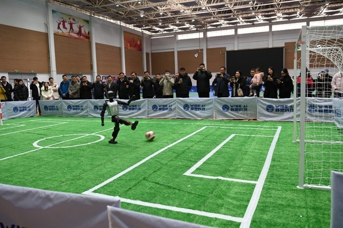 开幕式结束后,与会嘉宾前往学校体育馆,现场观摩了人形机器人足球技术展示环节。山东大学等多所高校的代表性机器人在室内模拟绿茵场地上,展示了射门等一系列动态演示。