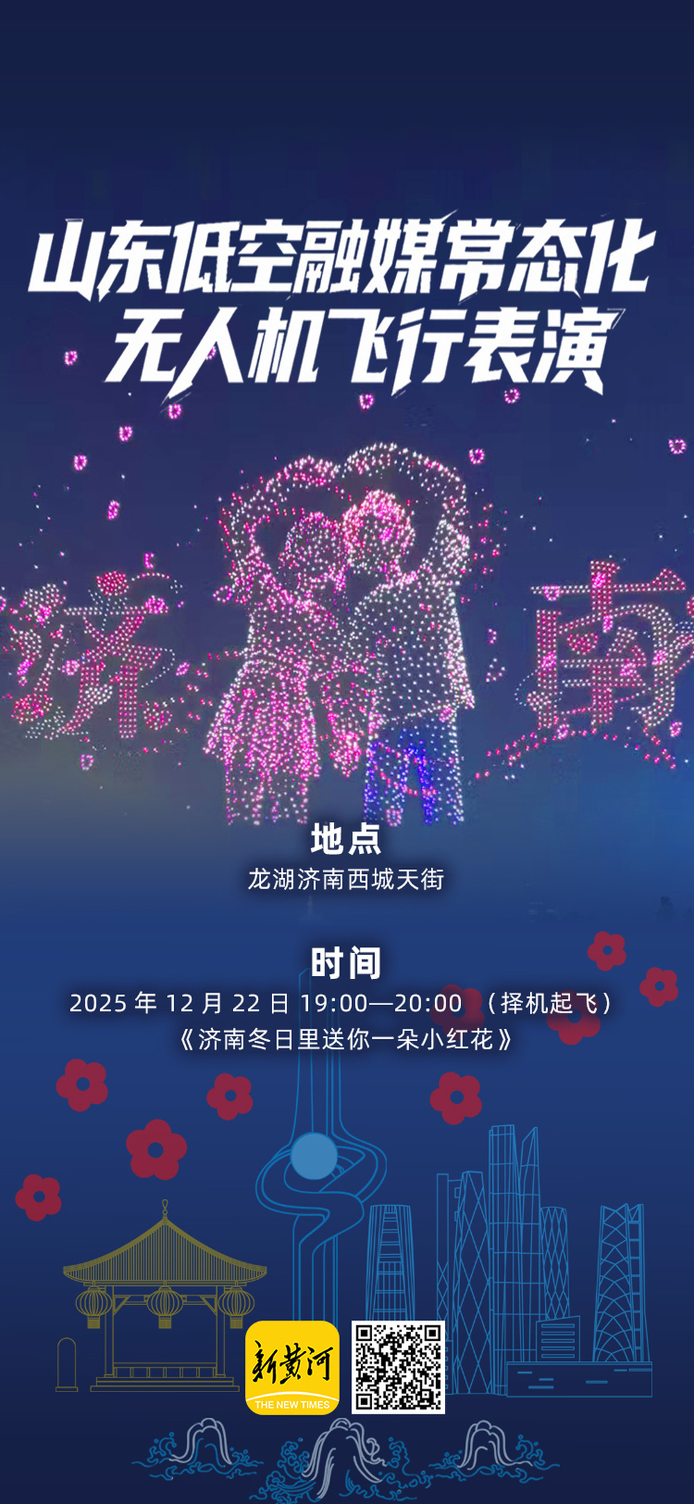 据悉,此次无人机灯光秀是新黄河全媒体传播(山东)集团有限公司旗下山东低空融媒打造的常态化主题展演,设置两大特色分主题:12月22日聚焦“济南冬日里送你一朵小红花”,以温暖符号传递城市温情;12月23日推出“济南时报创刊30周年品牌荣耀之夜”,用光影叙事致敬媒体初心。两场表演均定于当日19:00—20:00择机举行,每场演出时间约15分钟。观众可前往龙湖济南西城天街周边公共观赏区域,免费邂逅这场空中视觉盛宴。