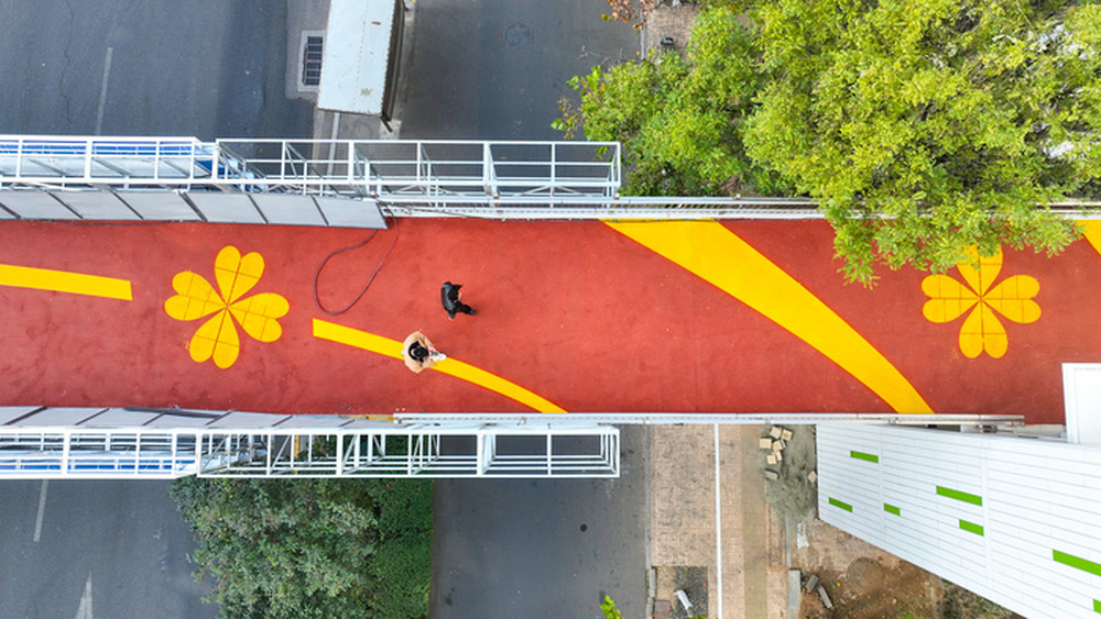 在过街天桥升级中,兼具个性化改造,体现了“一桥一景”。新升级的经十路与经七路交叉口东侧过街天桥,红色地面辅以明黄色的绸带图案装饰,点缀绽放的花朵,打造出艺术化氛围,为城市公共空间注入美学活力。