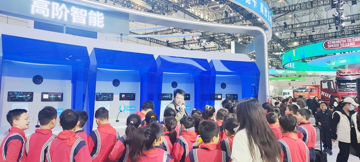 众多沉浸式体验活动吸引诸多市民与孩童排队打卡。在高阶智能体验区,中国重汽新推出的“小重”1.0,吸引义轩小学四年级一班的30多名学生轮流体验。该班学生卢柏兴体验后告诉新黄河记者:“AI技术发展越来越先进了,卡车不仅外形很酷,也越来越智能了。”谢宜凡则感慨:“卡车科技感十足,感觉很震撼。”