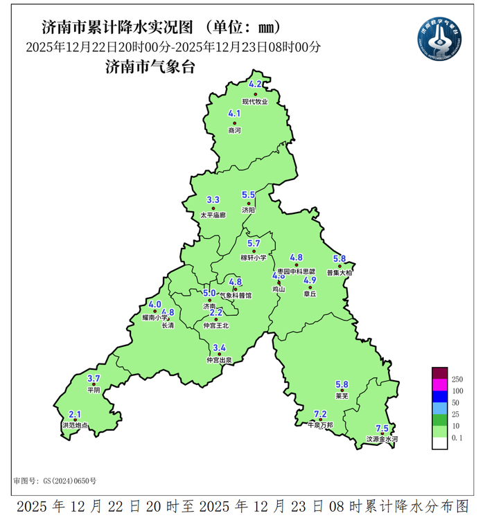 从昨天20时至今天8时,全市平均降雨量达4.7毫米,其中钢城区汶源金水河最大,为7.5毫米,折合水量约0.48亿立方米,市区5毫米、长清区4.4毫米、平阴县2.9毫米、济阳区5.5毫米、商河县4.2毫米、章丘区5.2毫米、莱芜区6.5毫米、钢城区7.5毫米、南山区2.8毫米、起步区3.3毫米、历城区4.8毫米、高新区5.2毫米。