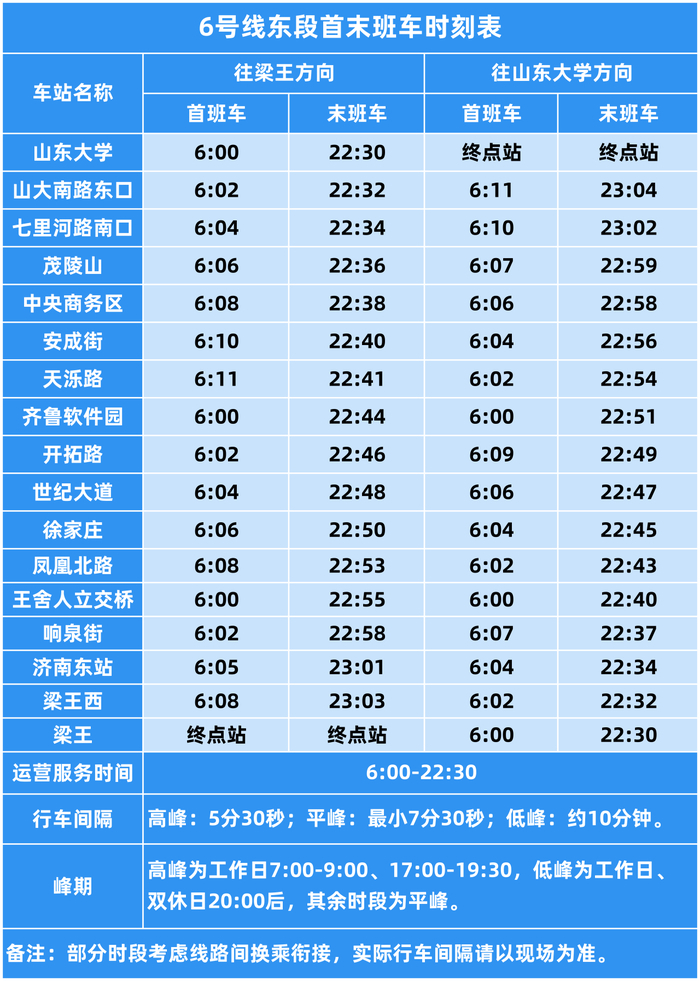 6号线串联济南西站、济南站、济南东站三大铁路枢纽,此次率先开通的东段(山东大学站至梁王站)全长19.5公里,设站17座,连接山东大学、中央商务区、软件园、济南东站等重要功能区域,三条线(段)开通运营后,运营服务时间、运行方式、行车间隔等将有所调整。