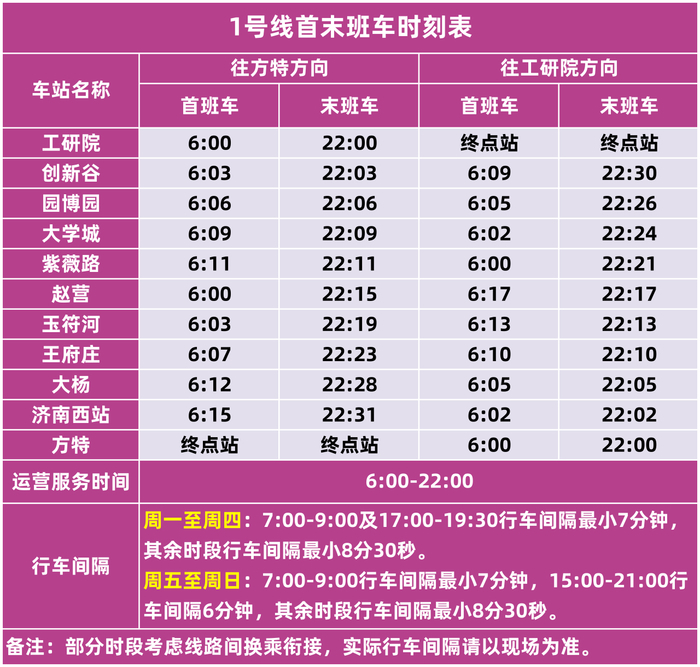此外,4、8号线及6号线东段开通后,1、2、3号线列车的到发时刻、停站时间均有调整。您可通过“济南地铁”App查询全天列车到站时刻,合理规划出行行程。