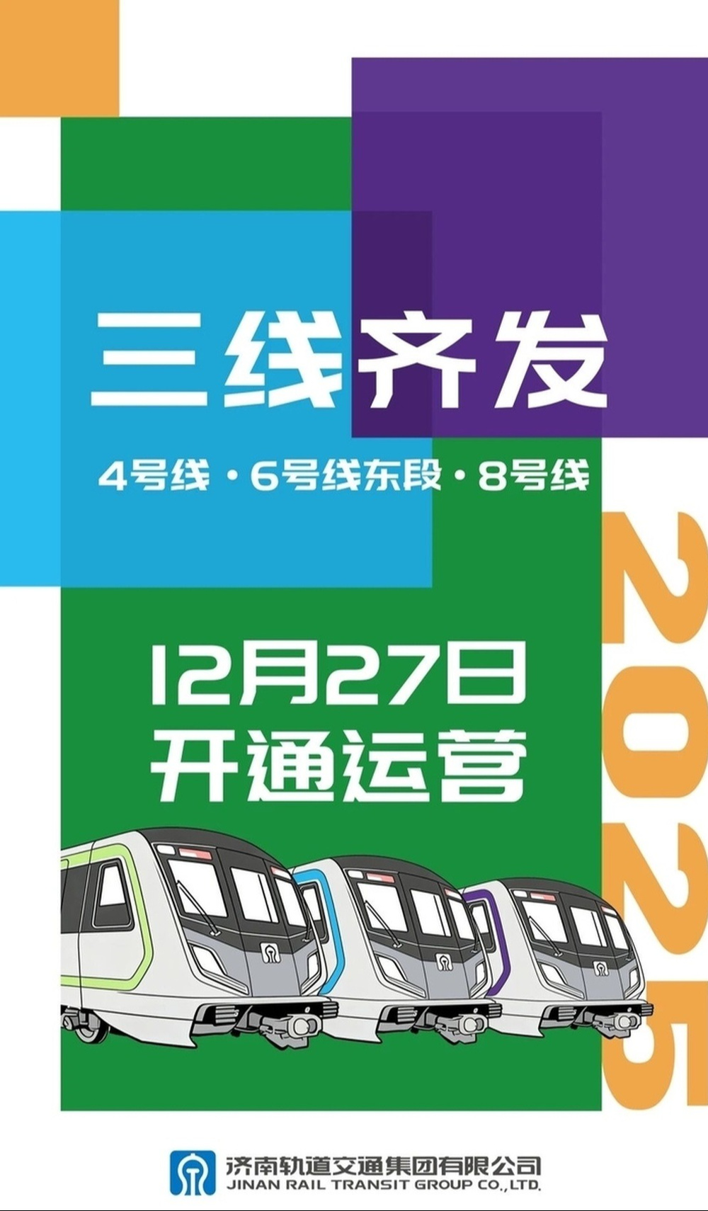 12月25日,济南轨道交通集团发布济南地铁4、8号线和6号线东段通车消息,三条地铁新线将于12月27日10时15分开通运营,届时市民可在任一车站进站乘车。