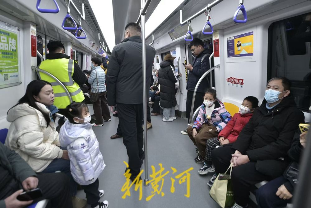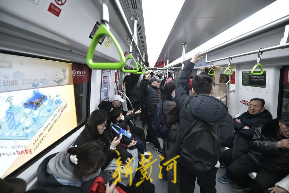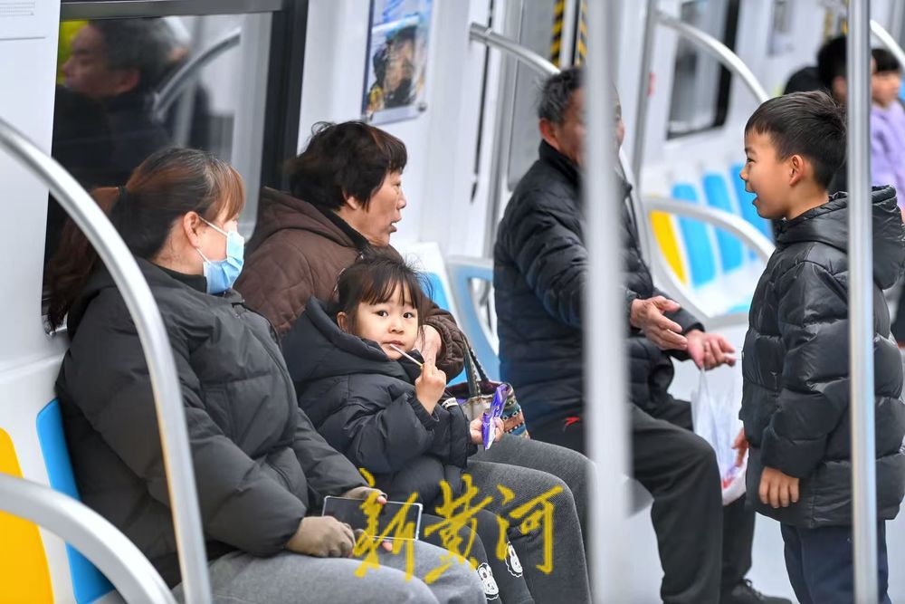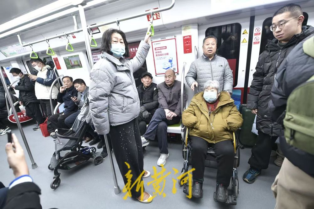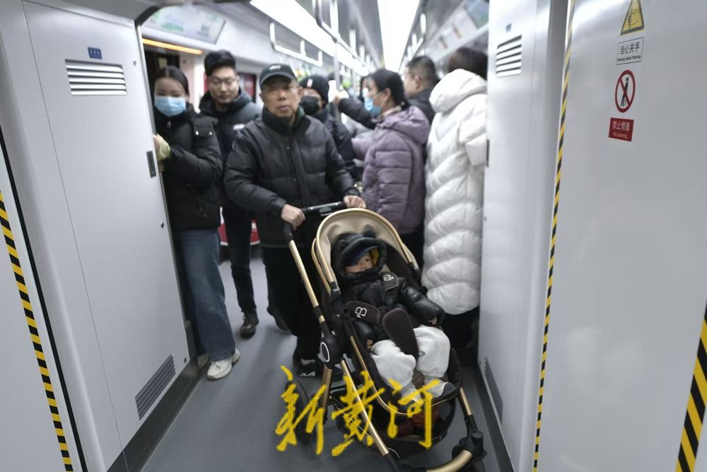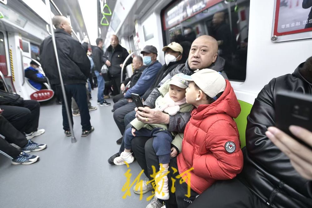 地铁4号线第一医科大学开往清源大街的列车,途经南辛庄站时,车厢内座无虚席,不少老人和孩子在家人的陪伴下前来体验。