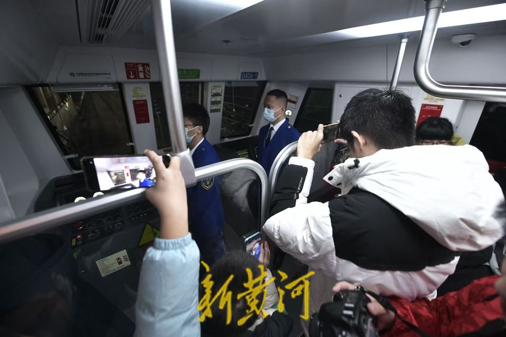 地铁4号线从山东第一医科大学发出的列车抵达千佛山站,6节车厢里均挤满乘客,尤其在第一节车厢,众多地铁迷隔着玻璃拍摄驾驶室,记录地铁行进的瞬间。