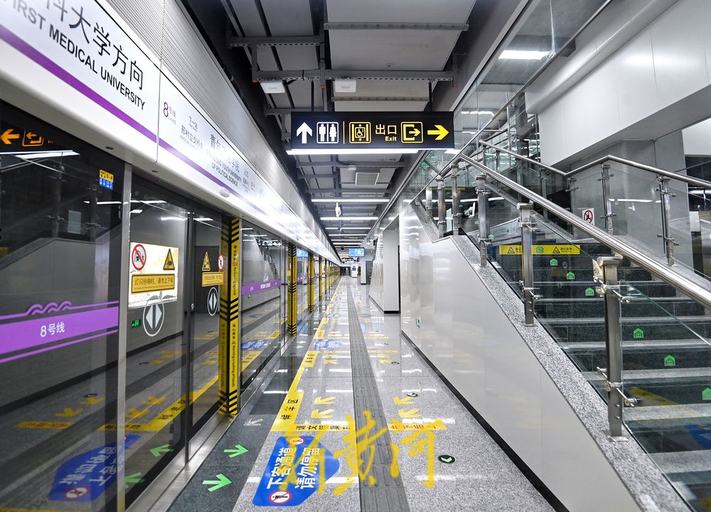 通过统筹考虑站点分布、沿线周边配套特点等情况,4、8号线采用辐射范围更广、行车组织更灵活的“Y”型交路运行方式。在工作日6:00-20:00贯通运行,高峰时段共线段(第一医科大学站至邢村立交桥东站)行车间隔仅4分30秒,支线段间隔9分钟,实现运力高效匹配。20点至运营结束,采用独立运行方式。