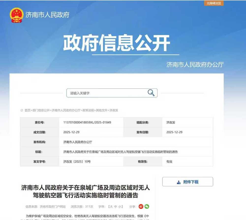 近日,济南市政府网站发布了《济南市人民政府关于在泉城广场及周边区域对无人驾驶航空器飞行活动实施临时管制的通告》。为维护泉城广场及周边区域低空安全,杜绝各类无人驾驶航空器违法违规飞行活动发生,根据《中华人民共和国治安管理处罚法》《无人驾驶航空器飞行管理暂行条例》等有关法律法规规定,对济南市部分区域进行临时空域管制。