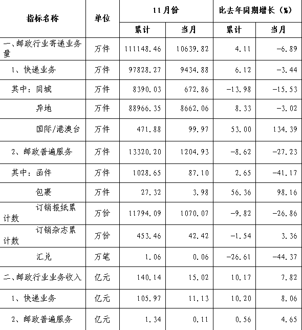 11月份,邮政行业业务收入(不包括邮政储蓄银行直接营业收入)完成15.02亿元,同比增长7.82%。其中,快递业务收入完成11.13亿元,同比增长8.06%。