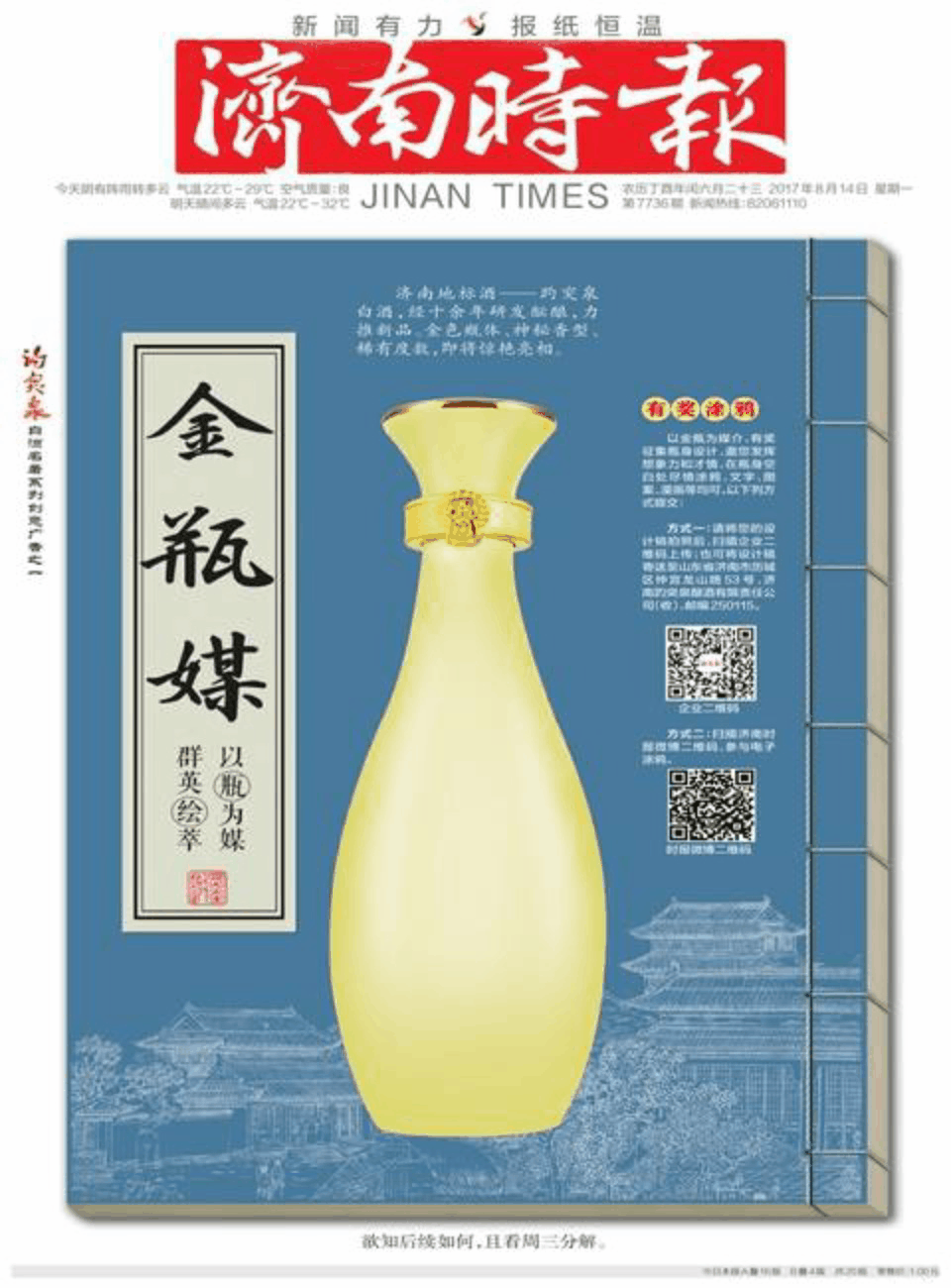 一本古籍线装书作为背景照片,“书名”是“金瓶媒”三个大字,落款写有“以‘瓶’为媒,群英‘绘’萃”字样,封面还有一个金色的明代风格经典酒瓶,这是2017年8月14日《济南时报》头版的设计样式。在邢介平办公室的书柜里,至今还珍藏着这份创意头版,在他看来,这不是简单的一份报纸广告,而是载入酒厂新品宣发历史的经典案例。