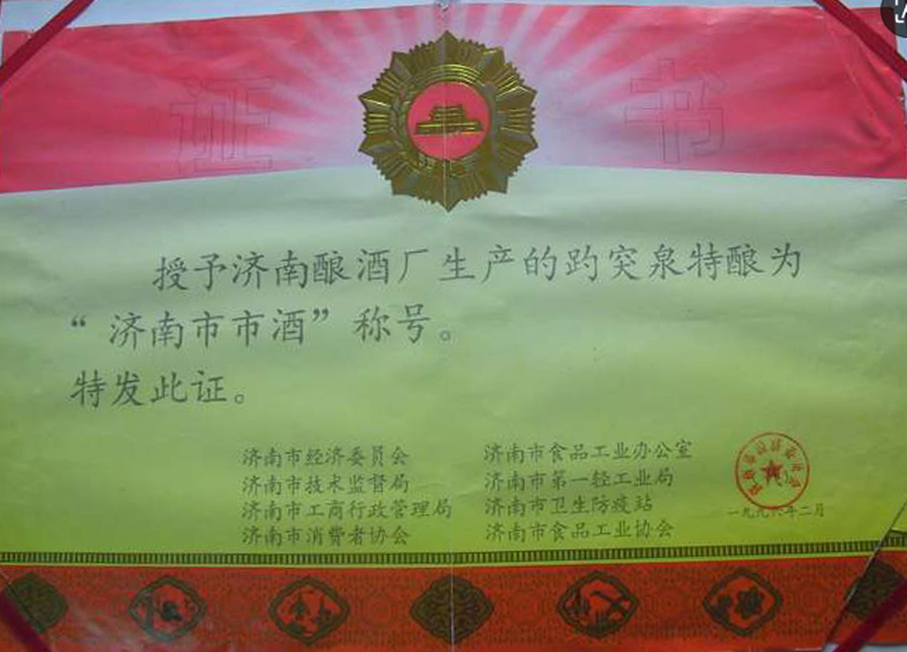 作为趵突泉酒业的创始人,邢介平回忆,早在1996年,也就是《济南时报》创刊的同一年,趵突泉特酿荣获“济南市市酒”称号;次年,“趵突泉”商标被评为“山东省著名商标”。1999年,原济南酿酒厂成为济南首批33家国企改制的试点企业之一,本着“生产一天不能停,职工一个不能下岗,债务一分钱不能悬空”的原则,顺利改制成功,建成济南趵突泉酿酒有限责任公司。