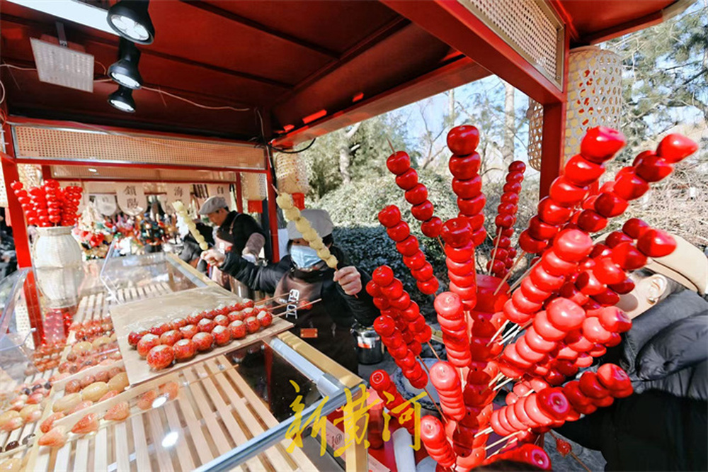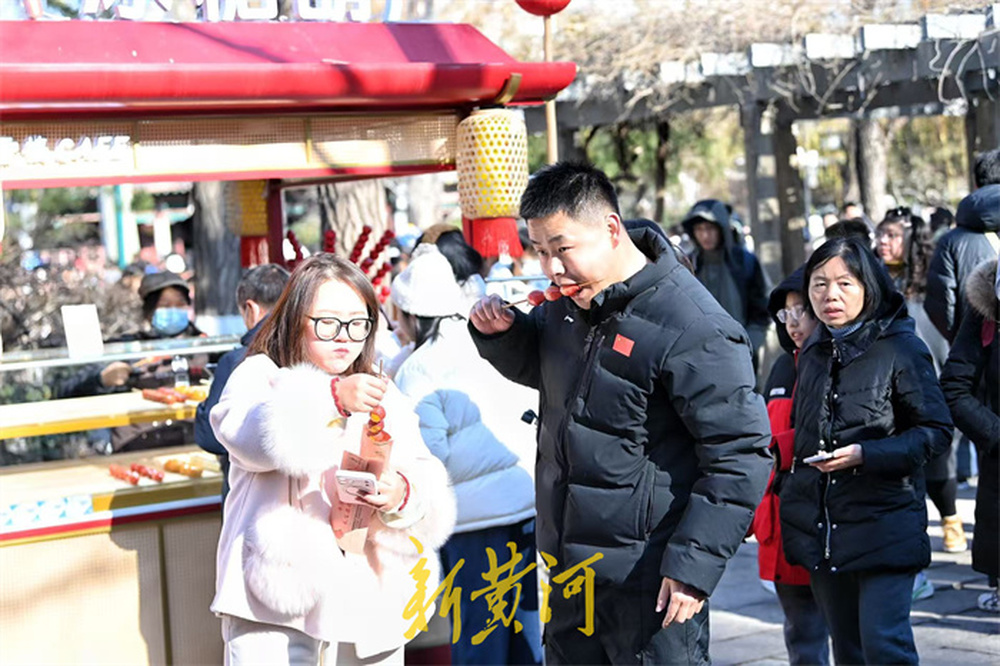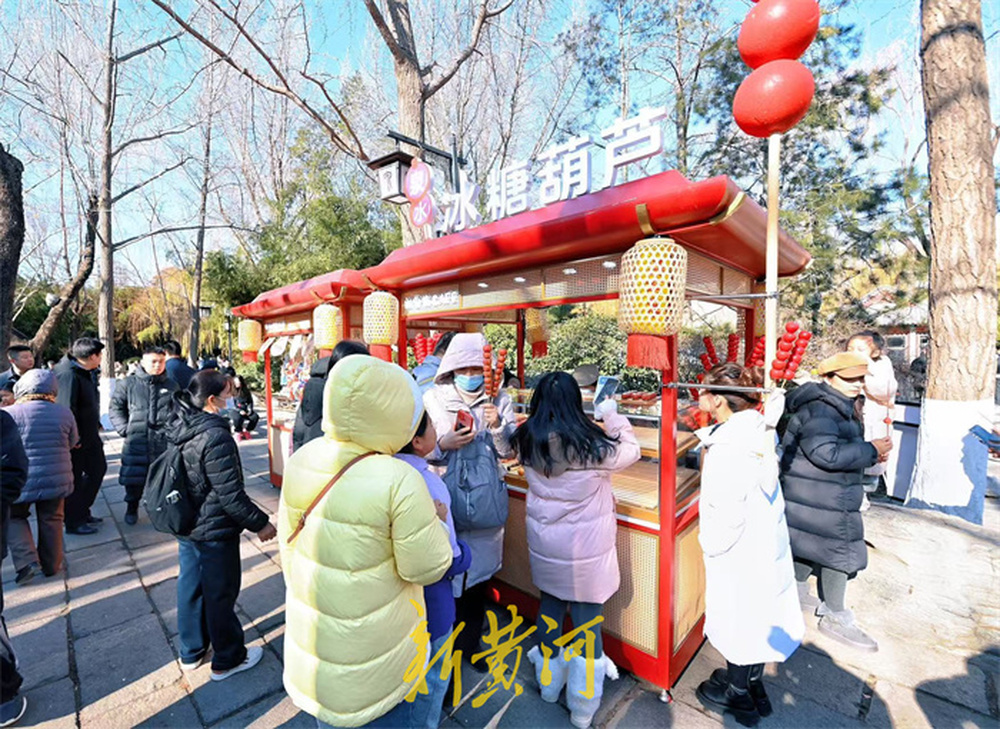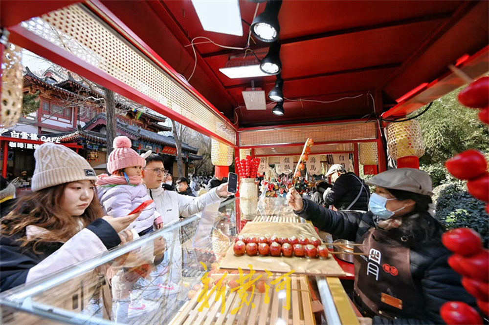 1月2日,新年伊始的趵突泉公园里,一串串晶莹甜蜜的泉水糖葫芦受到游客青睐,摊位前人头攒动,游客大饱口福,红彤彤的糖葫芦与新年的喜庆氛围相得益彰,为元旦假期的趵突泉增添了热闹氛围。