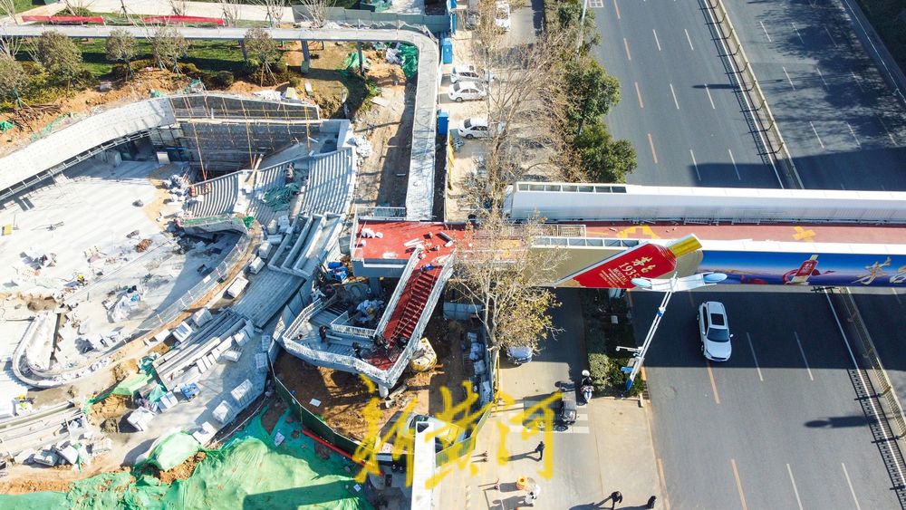 施工人员首先拆除了天桥北侧原有的步行楼梯,将原本的折返式楼梯改造为更为流畅、美观的回旋式设计。这一改造不仅提升了通行舒适度,使天桥与在建的“新槐苑文化体育公园”实现了无障碍连通。