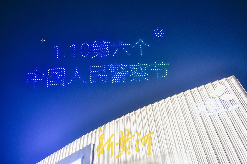 当指挥指令划破长空,数百架无人机同时升腾,如星河倾泻,瞬间点亮了冬夜的暮色。表演以醒目的“1.10,第六个人民警察节”字样开场,将“110”这一串刻在城市记忆深处的数字,从电话线的一端托举至浩瀚星空,象征着人民警察全天候、无间断的守护承诺。