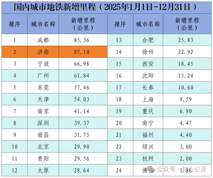在官方发布数据中,2025年度国内地铁新增里程数中,济南地铁4号线、8号线及6号线东段累计开通里程85.1公里,仅次于成都的85.36公里,居第2名。