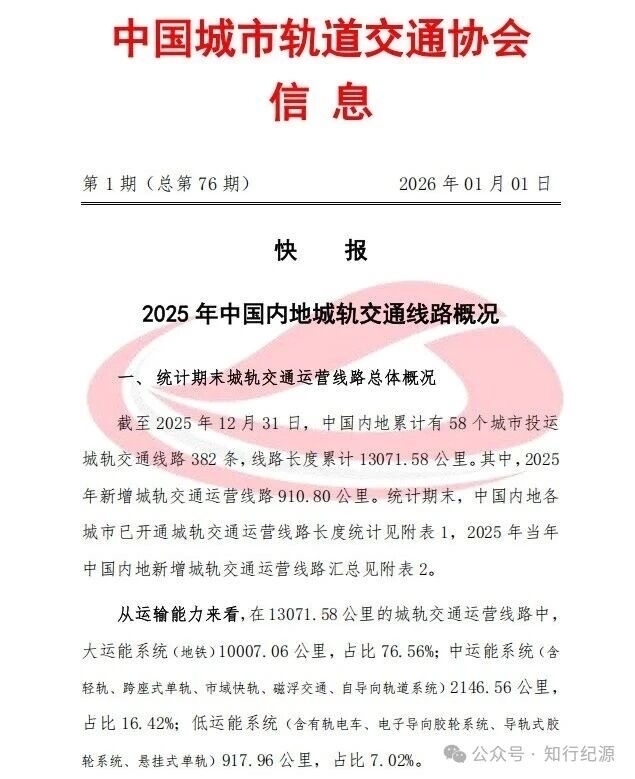 近日,2025国内轨道交通“期末成绩”放榜,中国城市轨道交通协会发布的官方信息数据显示:截至2025年12月31日,中国内地城轨交通运营里程达到了13071.58公里。其中,2025年新增910.80公里。