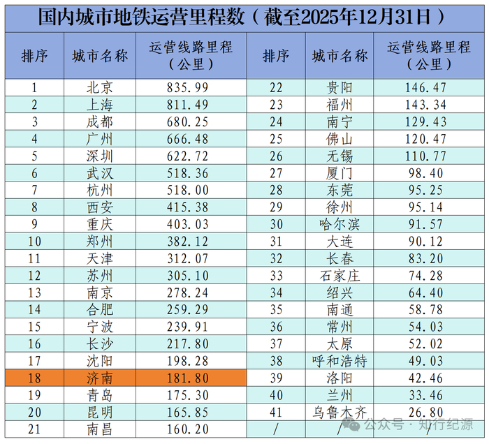 但截止到2025年12月31日,在国内城市地铁运营里程数排名中,济南开通运营地铁线路里程数181.8公里,排名直接来到了第18位,一举超越省内兄弟城市青岛,以及国内厦门、无锡等起步较早的城市。