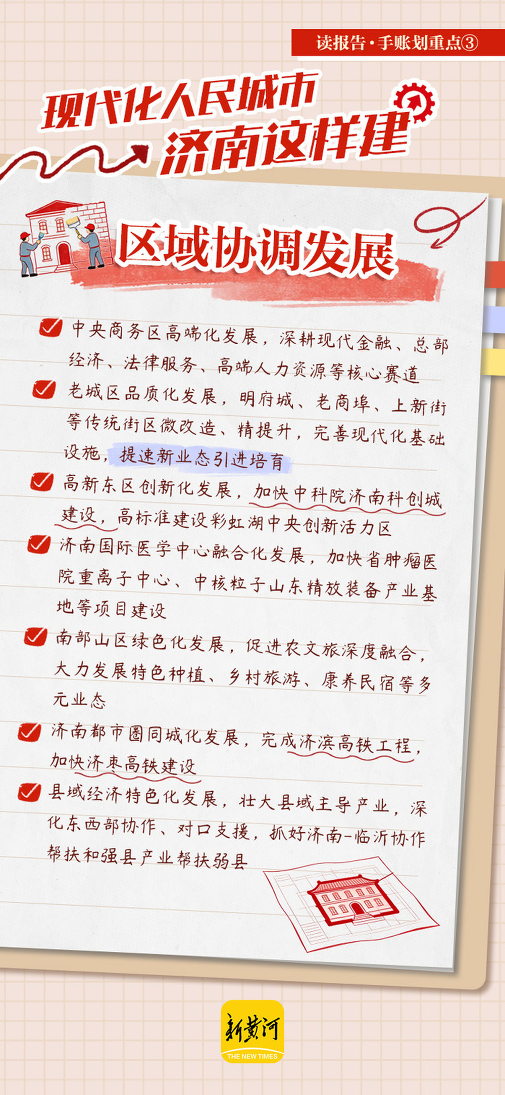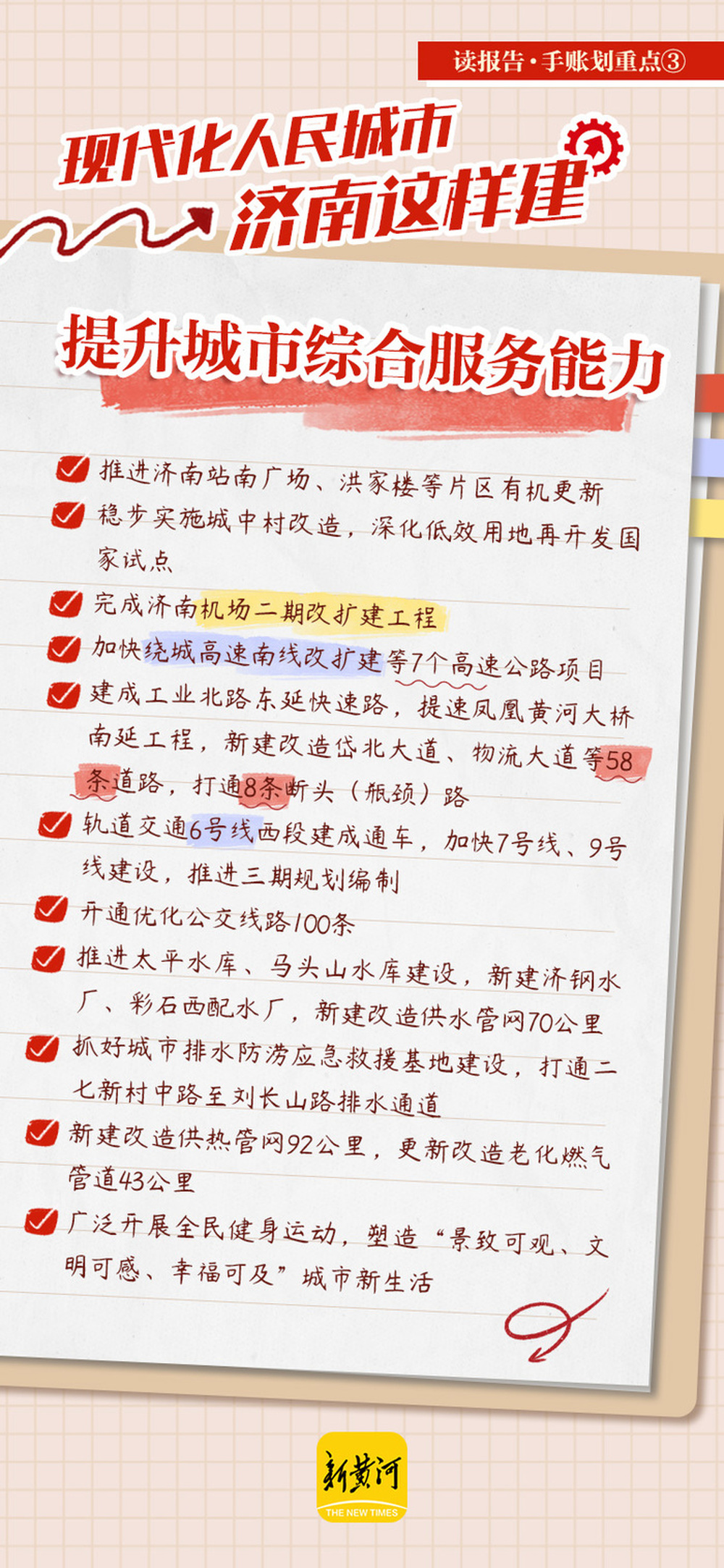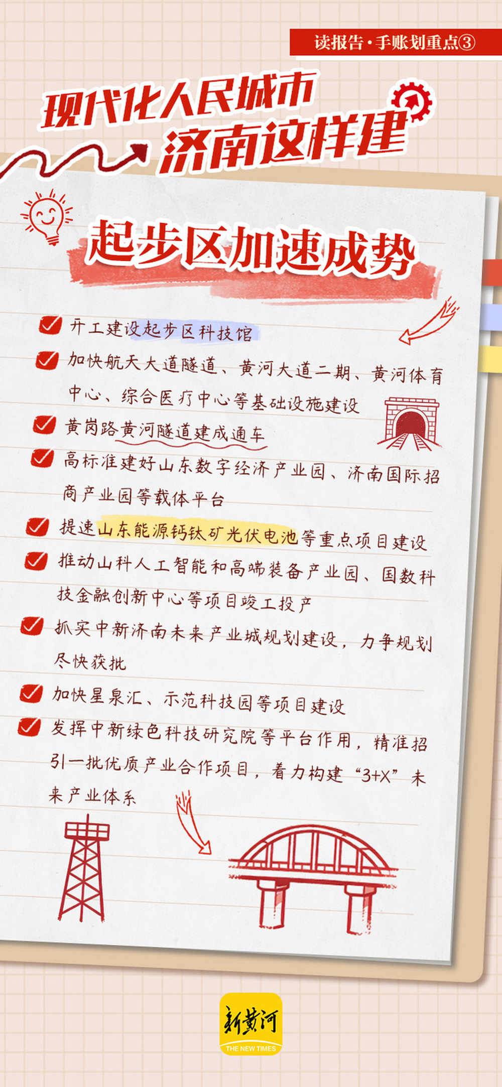 今年的政府工作报告提出,2026年,济南市围绕“现代化人民城市”建设目标,将从推动起步区加速成势、区域协调发展、提升城市综合承载力三大维度同步发力,加快城市发展方式由外延扩张向内涵提升转变,让城市发展成果更多更公平惠及全体市民。未来一年,我们的城市将有哪些变化?手账划重点↓↓↓