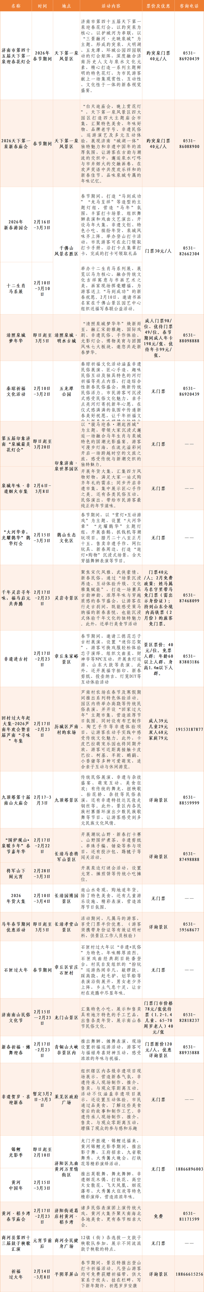 为进一步丰富冬季文旅产品供给,满足市民游客春节前后文旅消费需求,济南市文化和旅游局启动了“这一站,济南”2026新春贺年会,并积极发动各区县文化和旅游主管部门及全市文旅行业单位,深挖泉城特色资源,围绕小年、春节、元宵节等重要节点,精心策划推出节庆民俗、潮玩亲子、激情冰雪、多彩文博、泉城好戏等五大类300多项重点文旅活动。