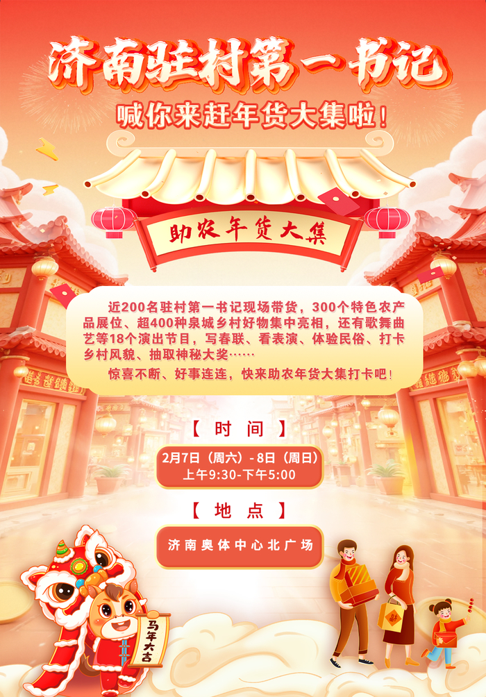 2月7日至8日,在济南奥体中心北广场,200名济南市驻村第一书记现场带货,300个特色农产品展位、超400种泉城乡村好物集中亮相,现场还有歌舞、曲艺等18个演出节目,写春联、看表演、体验民俗、打卡乡村风貌、抽取神秘大奖等,欢迎市民前来赶大集。
