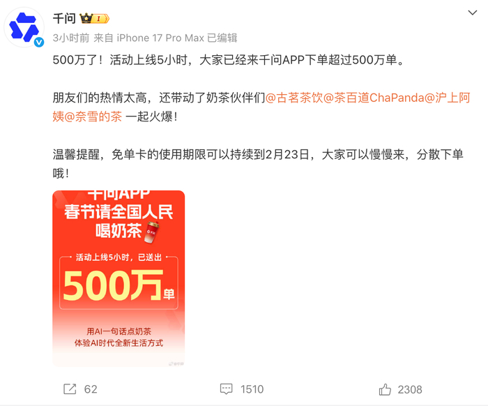对此,千问官方微博发文回应称:“活动上线5小时,大家已经来千问App下单超过500万单。免单送奶茶活动太火爆,正在紧急加资源,全力保障顺畅,请大家稍稍等待。”并提醒用户,免单卡的使用期限可以持续到2月23日,可以分散下单。