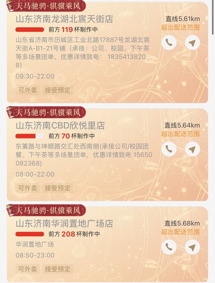 除此之外,记者在奶茶外卖点单平台注意到,多家奶茶门店状态均标注为“排队制作中”。霸王茶姬经四路万达广场店有高达488杯正在制作,华润置地广场店显示“前方208杯制作中”,恒隆广场店与印象济南店均显示“繁忙中”。CoCo都可的情况同样火爆,济南万达店预计等待332杯,凤鸣广场店预计203杯,世纪大道万达店123杯,其他多家分店等待杯数也接近百杯。多家奶茶门店的状态栏,均被清一色的“排队制作中”所占据。