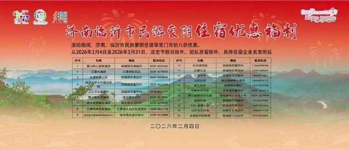 济南市民游蒙阴住宿享受门市价八折优惠。(从2026年2月4日至2026年3月31日,法定节假日除外,团队游客除外,具体住宿企业名录附后)