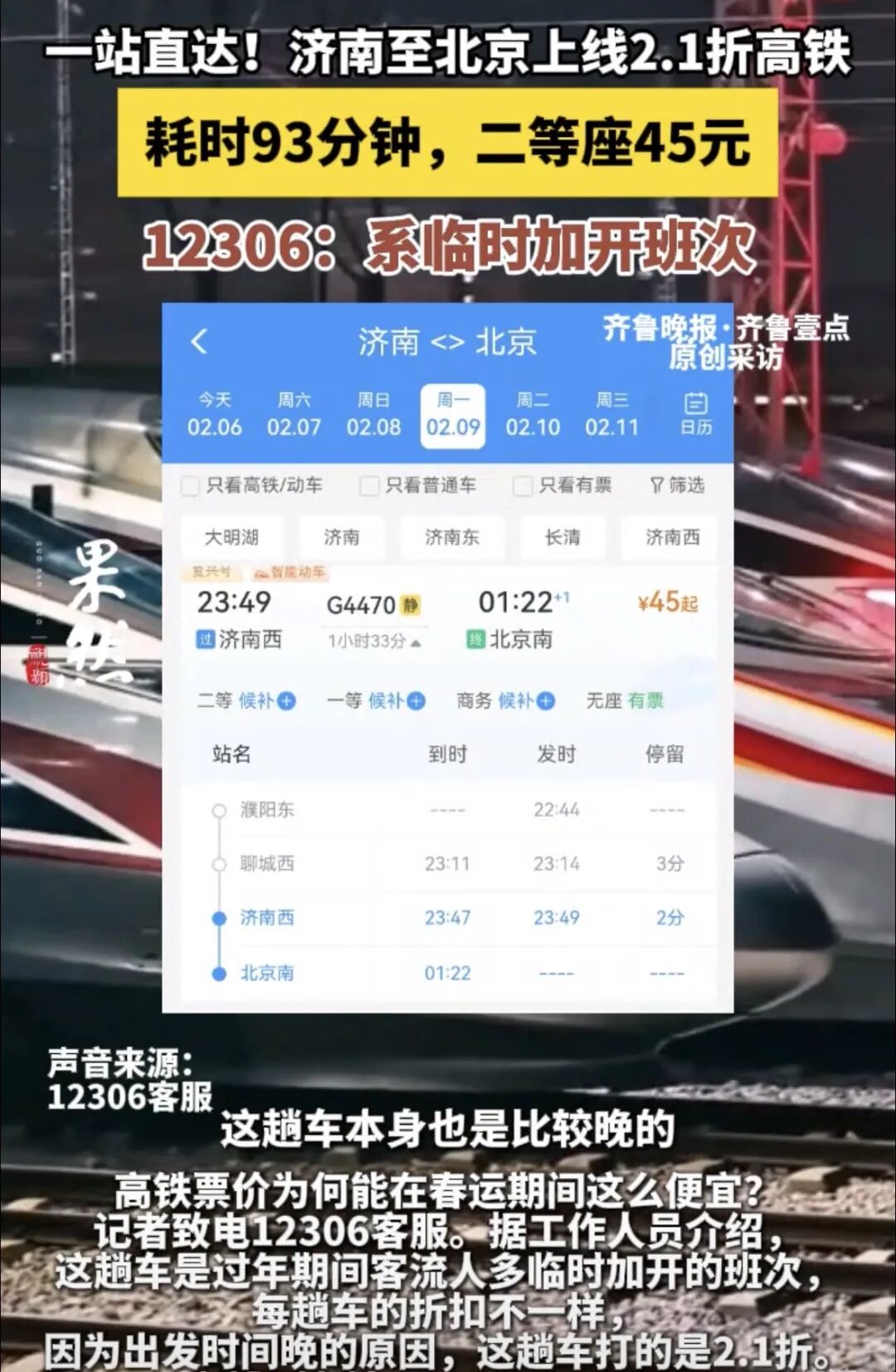 高铁票价为何能在春运期间这么便宜?记者致电12306客服。据工作人员介绍,这趟车是过年期间客流人多临时加开的班次,每趟车的折扣不一样,因为出发时间晚的原因,这趟车打的是2.1折。