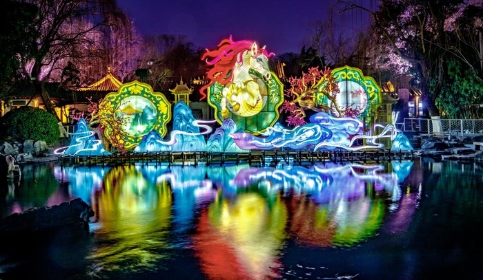 四大园区各具特色而又主题鲜明。趵突泉以古韵国风的创新呈现,解锁年轻人眼中的“顶流审美”;五龙潭公园结合秦琼祈福这一传统民俗,推出“河灯祈福”特色活动;大明湖景区创新开发Q版“少女雨荷”系列场景,生动还原湖畔少女的鲜活日常;护城河以独特的游船赏灯视角,形成“水上夜游+岸边漫步”的沉浸式夜游场景。