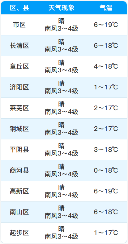 晴,南风3~4级,最低气温市区6°C左右,其他区县0~6°C,最高气温19°C左右。