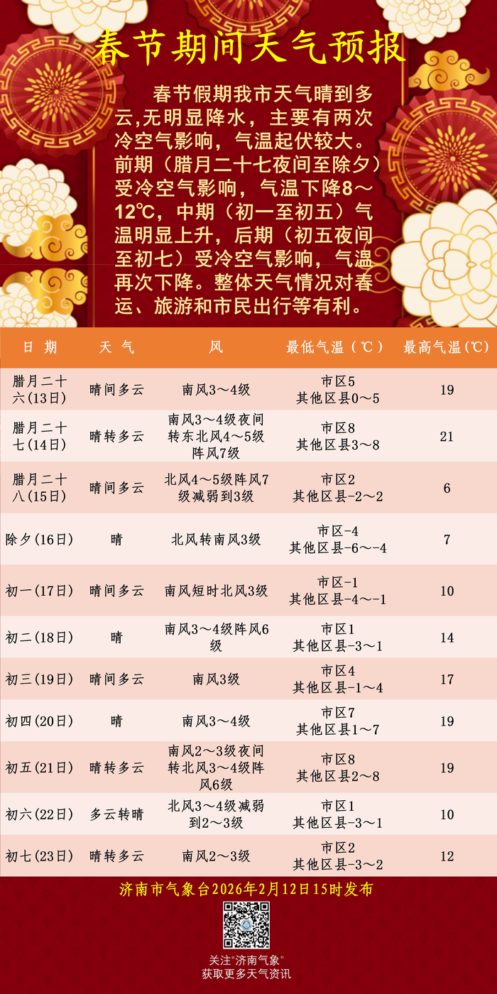 济南市气象台12日15时发布春节期间天气预报:2026年春节假期我市天气晴到多云,无明显降水,主要有两次冷空气影响,气温起伏较大。前期(腊月二十七夜间至除夕)受冷空气影响,气温下降8~12℃,中期(初一至初五)气温明显上升,后期(初五夜间至初七)受冷空气影响,气温再次下降。整体天气情况对春运、旅游和市民出行等有利。具体预报如下: