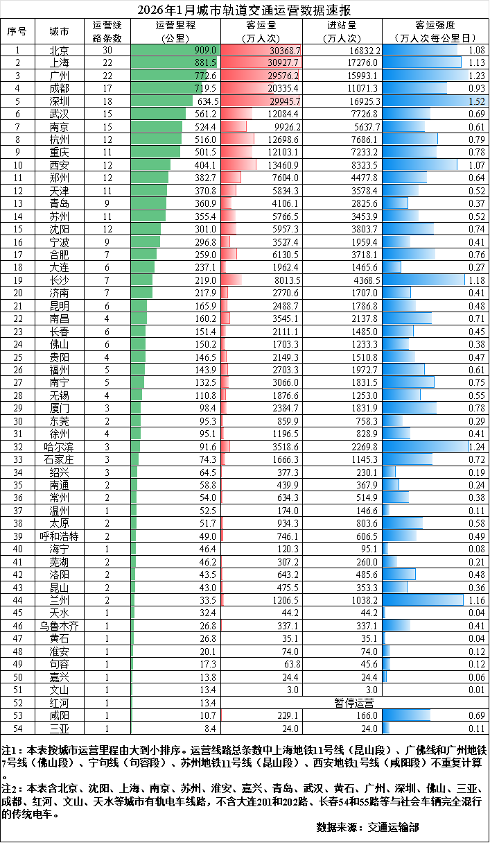 交通运输部数据显示,2026年1月济南轨道交通客运强度为0.41(单位:万人次每公里日;下同),较2025年12月的0.43,下降0.02。