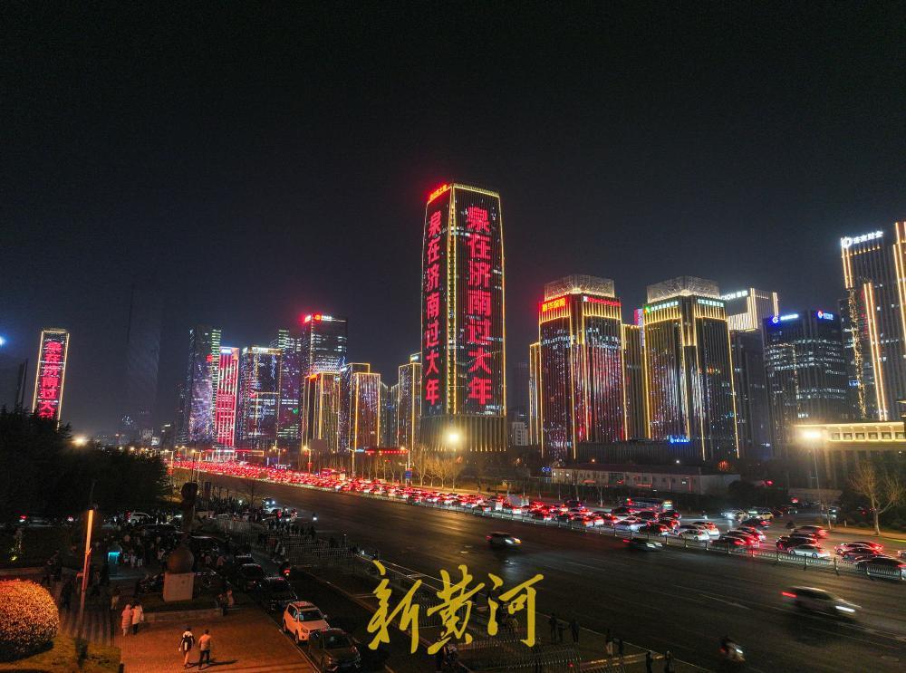 “泉在济南过大年”“四季泉城”等温情有力的标语在高楼外墙上交替闪亮,画面中奔跑的骏马与城市流动的车流交相辉映。灯光秀以楼为屏,以光为笔,将传统年俗与现代光影艺术融合,勾勒出属于济南的新春仪式感。泉城以最闪耀的姿态,邀四海宾朋共度中国年。