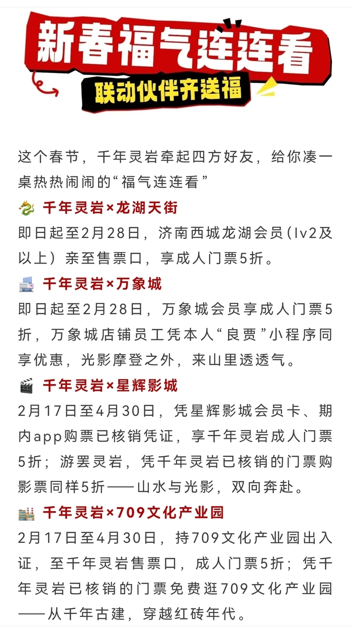 此外,济南西城龙湖会员,万象城会员、店铺员工及星辉影城会员,均可享灵岩寺成人门票5折。2月17日至4月30日,持709文化产业园出入证,也可享灵岩寺成人门票5折。