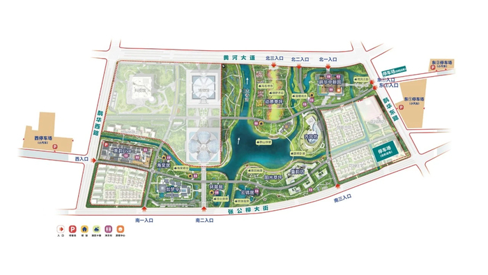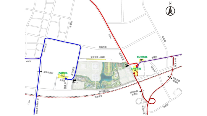 其中,黄河大桥方向车辆,建议走鹊华东路收费站-鹊华东路到东1停车场;或走岱北大道收费站-岱北大道-子美街到东2、东1停车场;子美街方向车辆,建议直接走子美街到东2、东1停车场;G104方向车辆,建议走G104-子美街到东2、东1停车场;济南济泺路北延黄河隧道方向和G308方向,建议走泺北大道-兰溪大街-鹊华西路,到西停车场。