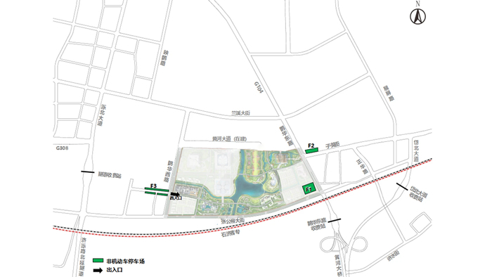 骑电动车、自行车的游客,有3个专属停车场,泊位充足,按进出动线走即可。其中,经G104、鹊华东路、张公柳大街可前往园区东南侧的F1非机动车停车场,1158个泊位;经G104、鹊华东路可达园区东北侧的F2非机动车停车场,513个泊位;经张公柳大街、兰溪大街、鹊华西路可达园区西侧F3非机动车停车场,1000个泊位。