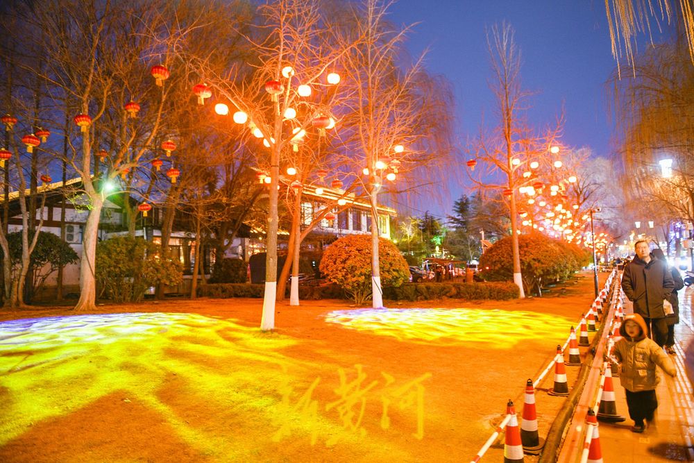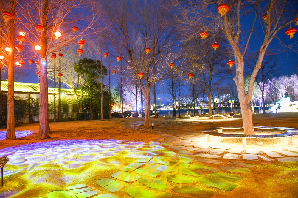 漫步湖畔,大红灯笼与粼粼波光交相辉映,浓浓的年味扑面而来。与此同时,共享绿地区域也焕然一新,新安装的投影灯在草坪上投射出水波纹的动态图案,光影流转间,仿佛泉水涌动、碧波荡漾,生动突显了泉城济南的独特水韵特色。