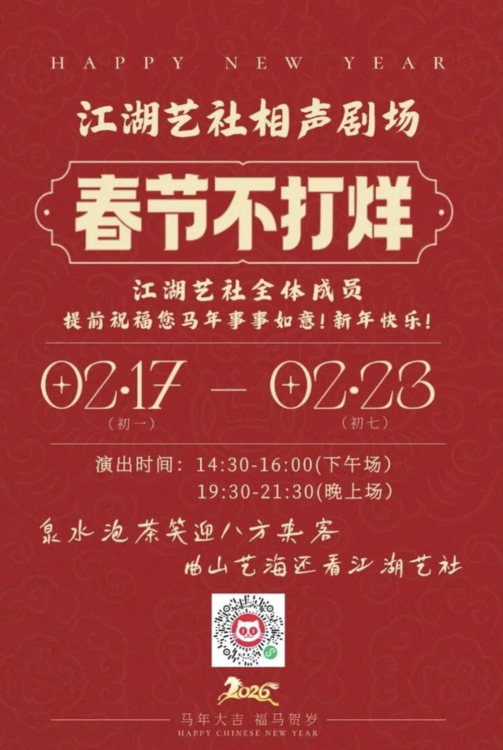 济南剧院“金马送福”非遗雅集公益文化专场如期启幕。2月18日(初二)演出首日,柳子戏《玩会跳船》《张飞闯辕门》与山东梆子《扈家庄》《老羊山·诉堂》轮番上演,专业乐队以板鼓、京胡等乐器伴奏,尽显非遗魅力。后续至2月21日(初五),每日仍有四场免费演出向公众开放。